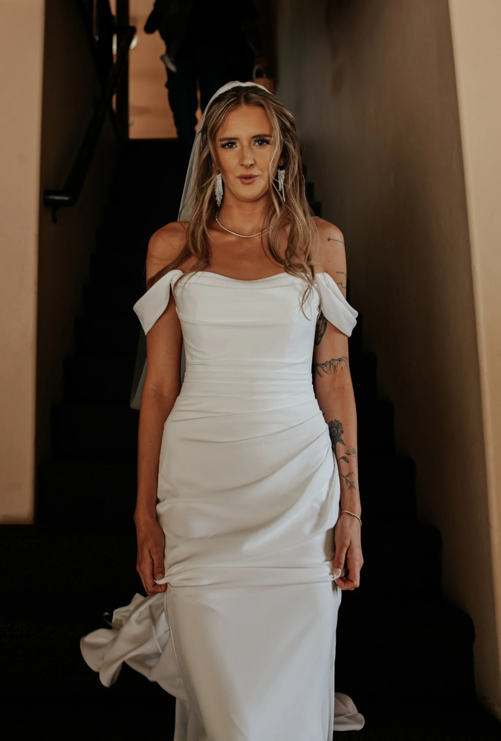 The day began in a quiet, light-filled space where the bride slipped into her elegant, off-the-shoulder gown. Her dress was sleek and timeless, paired with a cathedral-length veil that trailed gracefully behind her.