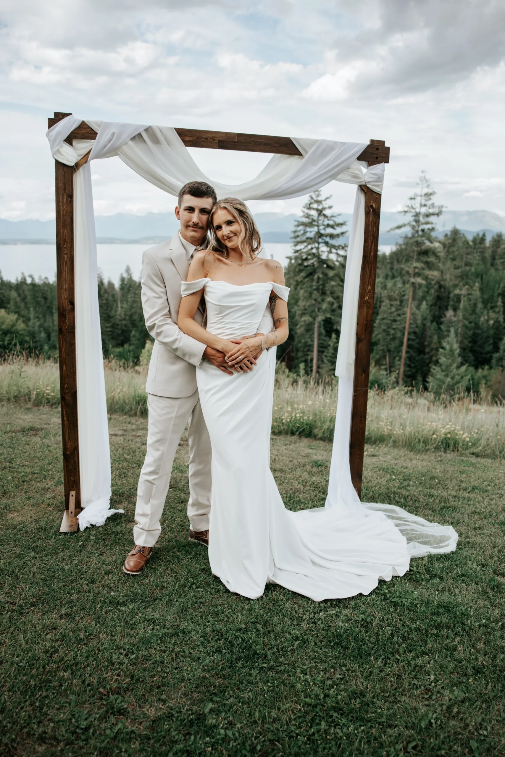 The ceremony took place outdoors with an incredible view of Flathead Lake, framed by distant mountains and Montana’s wide-open skies. The couple’s wooden arch, draped in soft white fabric and decorated with dried grasses and natural florals, perfectly complemented the natural surroundings.