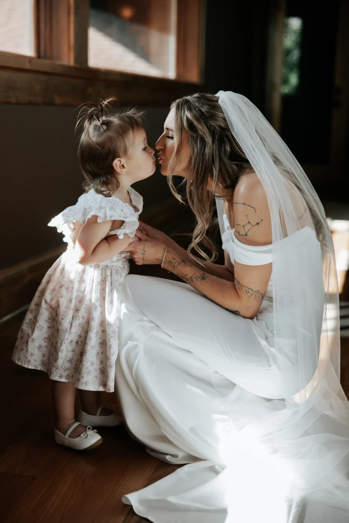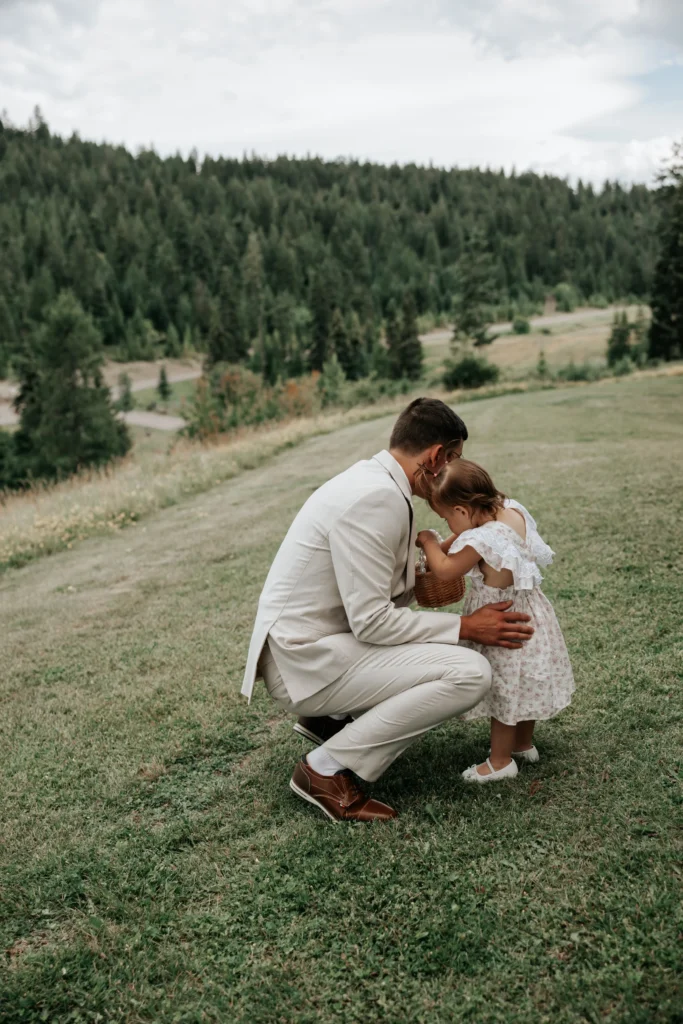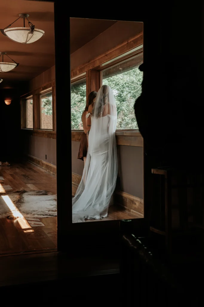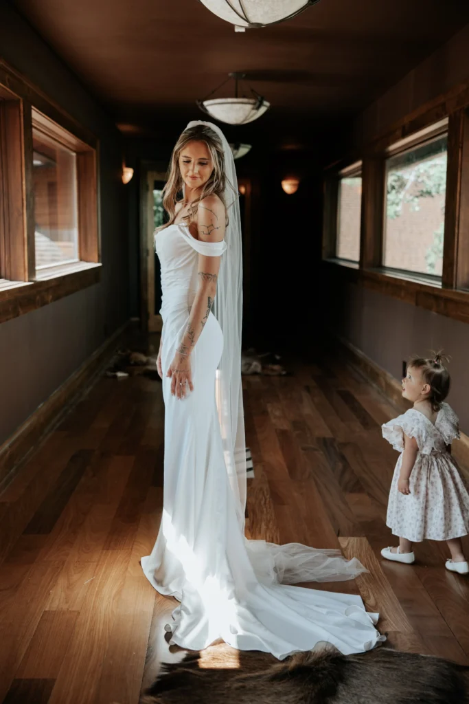 One of my favorite parts of the morning was capturing the quiet in-between moments — her standing by the window with a loved one, soaking in the view, and the little flower girl looking up at her in awe. These fleeting moments, when emotions are soft and unguarded, are what I love most about Montana intimate wedding photography.