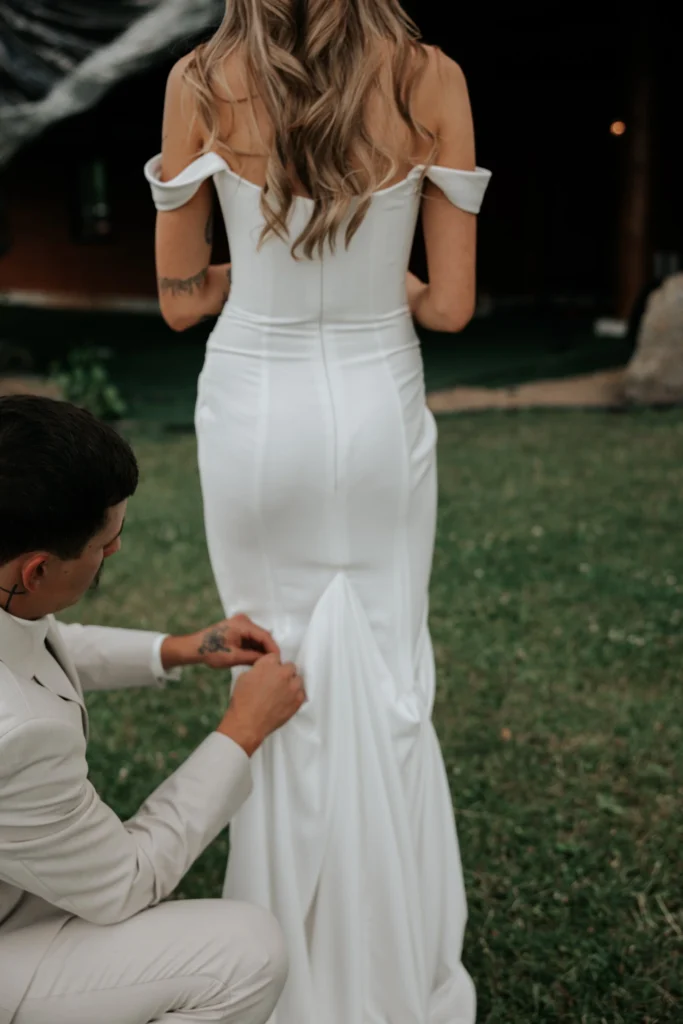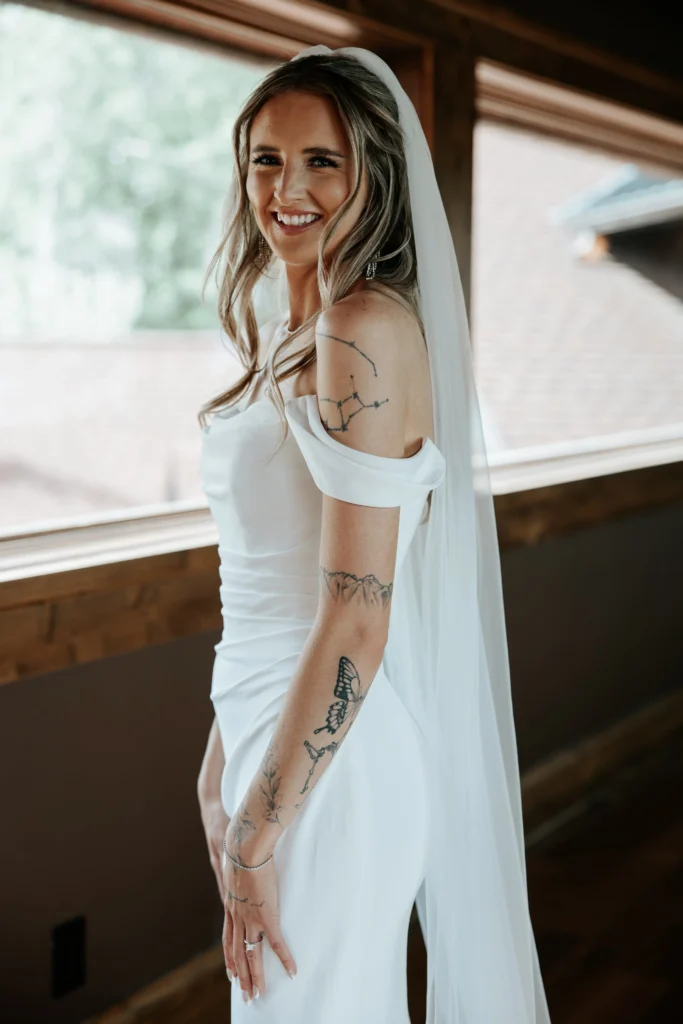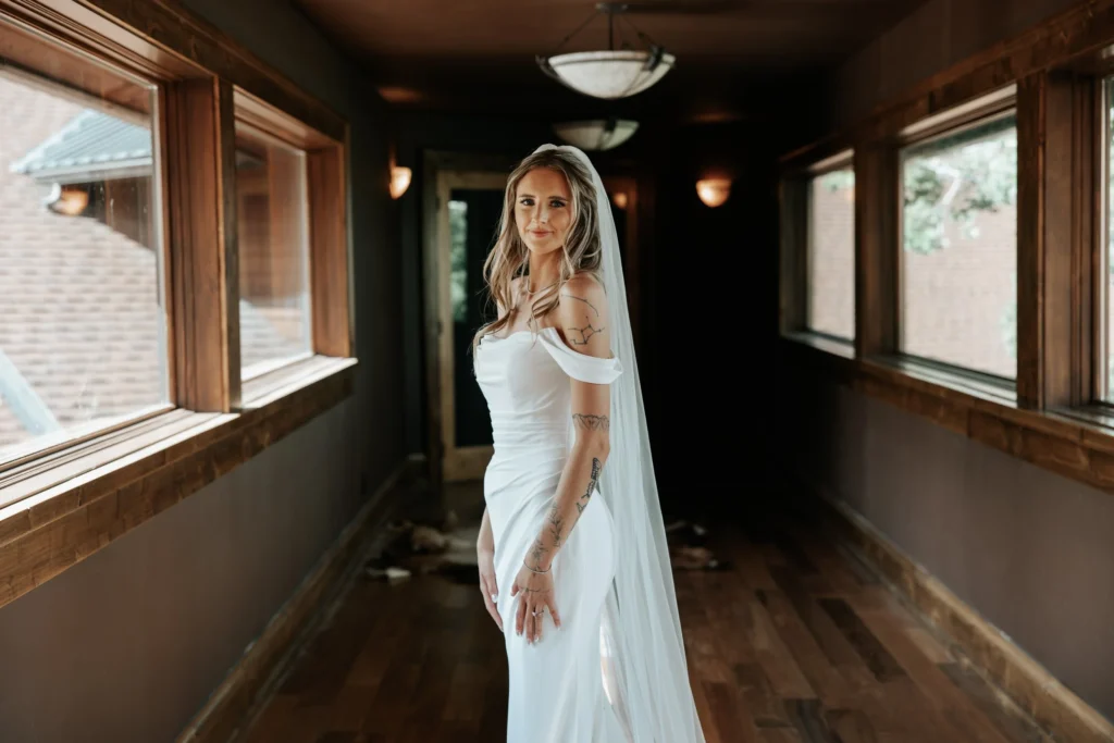 The day began in a quiet, light-filled space where the bride slipped into her elegant, off-the-shoulder gown. Her dress was sleek and timeless, paired with a cathedral-length veil that trailed gracefully behind her.