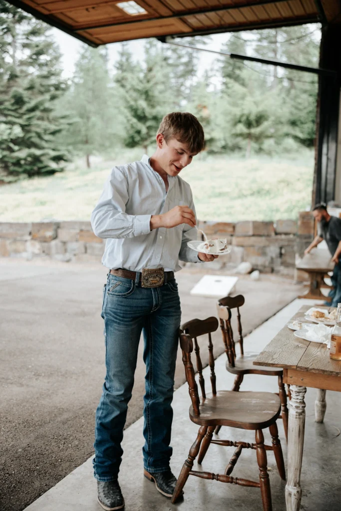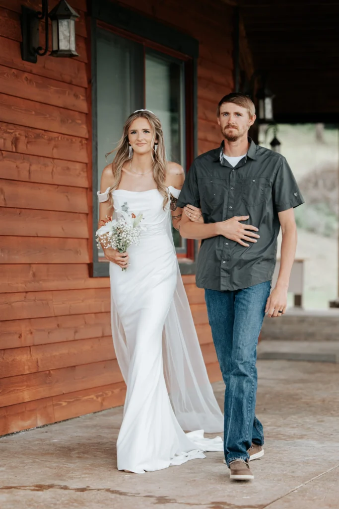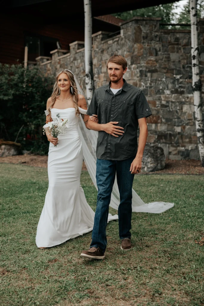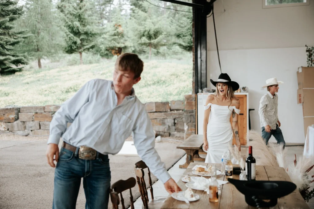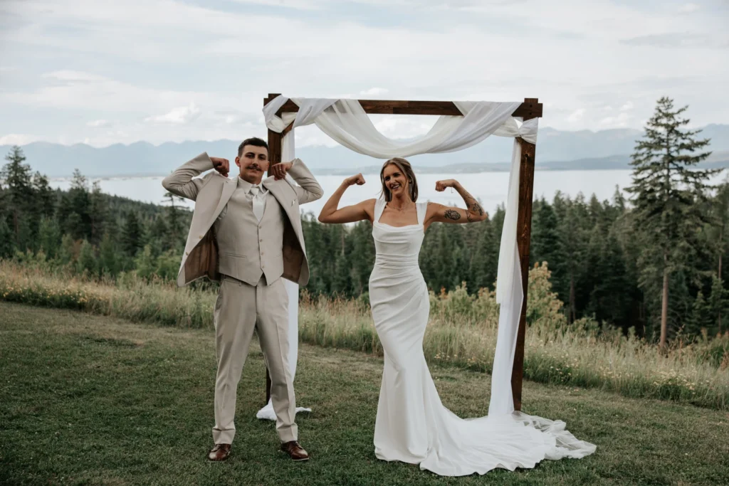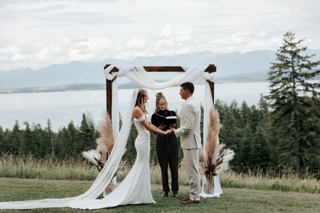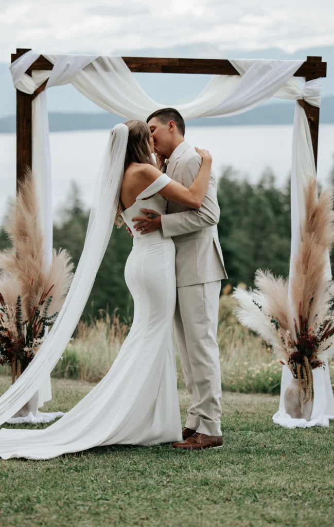 The ceremony took place outdoors with an incredible view of Flathead Lake, framed by distant mountains and Montana’s wide-open skies. The couple’s wooden arch, draped in soft white fabric and decorated with dried grasses and natural florals, perfectly complemented the natural surroundings.